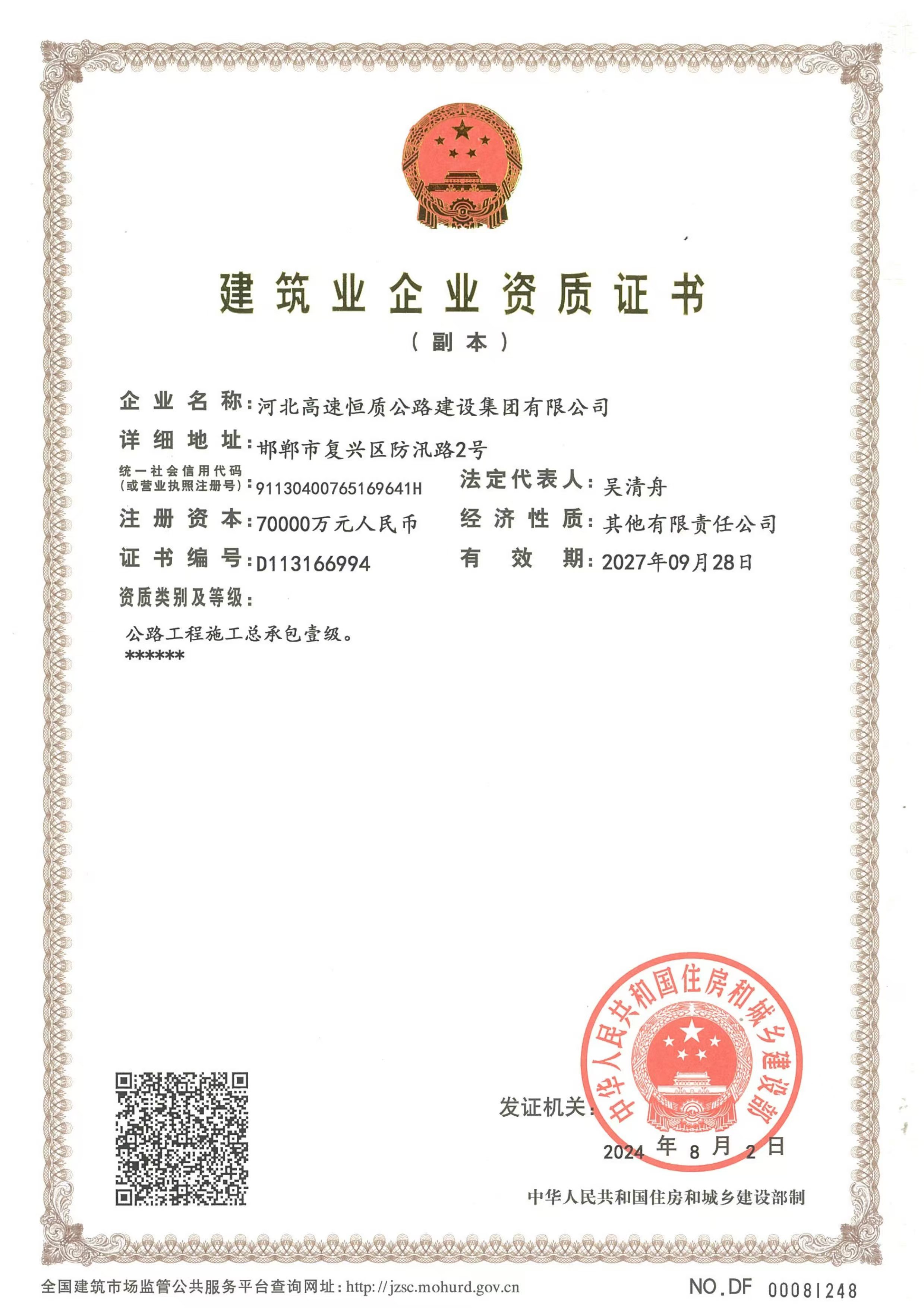 河北高速恒質公路建設集團有限公司始建于2004年,前身是邯鄲市恒質公路建設集團有限公司。2024年7月成為河北高速公路集團有限公司二級子公司,現有職工500余人,下轄18家子公司13個分公司,參股公司3家 ,注冊資本7億元,是一家集公路工程施工、路用材料研發生產、試驗檢測、瀝青貿易、公鐵物流于一體的多元化、綜合性單位,國家級高新技術企業,河北省專精特新中小企業,河北省首家瀝青拌合環保引領性企業。公司擁有公路工程總承包壹級、公路交通工程(公路安全設施)專業承包壹級、機電工程施工總承包貳級、電力工程施工總承包貳級、市政公用工程施工總承包貳級、建筑工...